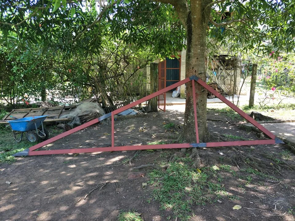 Trusses all welded and ready to go up. Now just painting the rest of the metal for the roof. The spots that are not being painted are where the parts will be welded together. Painting it all when up would take so long but painting it all down makes for nasty headaches when welding plus burnt pain doesn't clean up easy for touch up painting. Man metal work takes so much longer than wood. To bad we can't find long enough lumber to do these projects. Oh well these should last a long time!